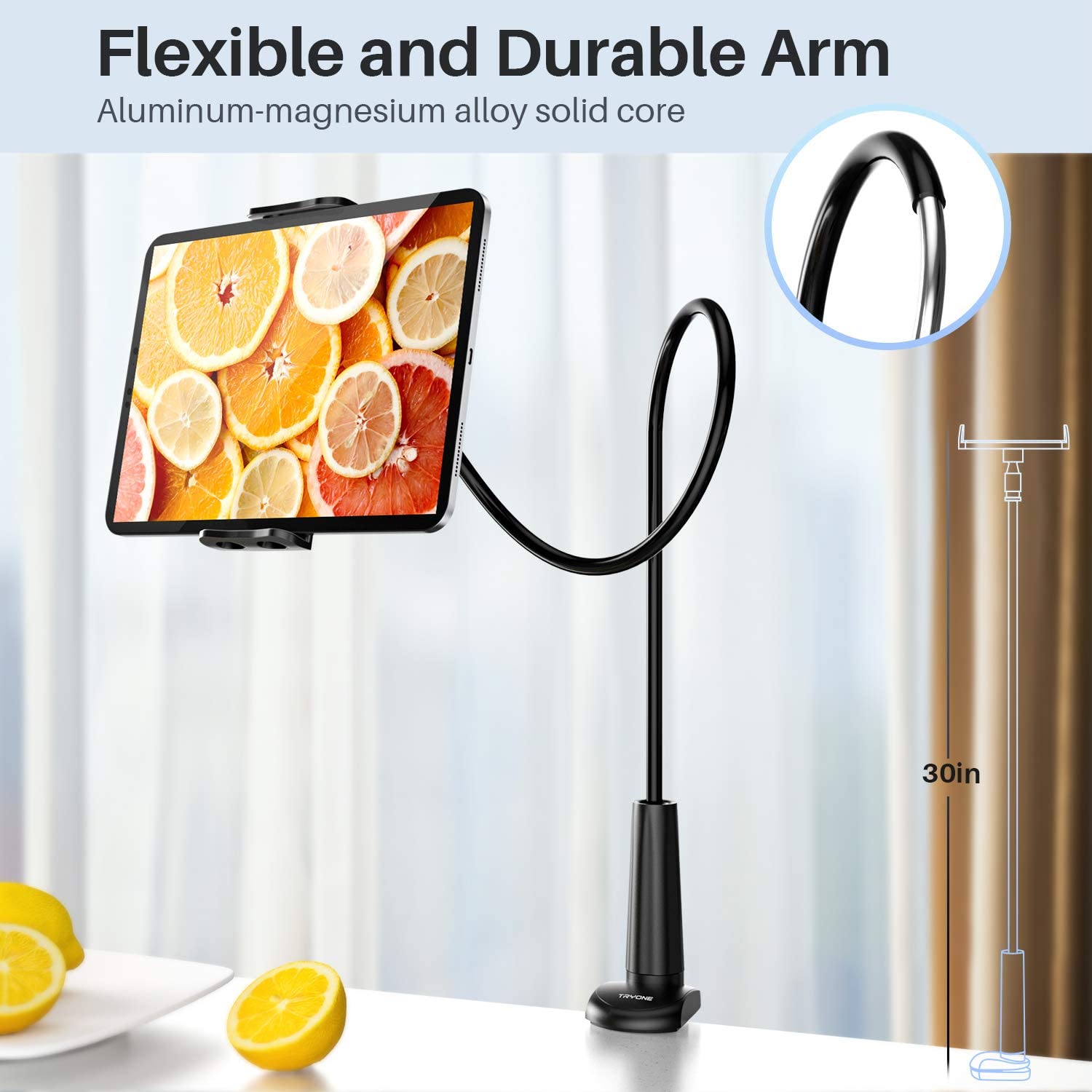 If you need the ultimate flexibility, you can stop your search now! The Tryone Gooseneck iPad holder is one of the most flexible options around.
